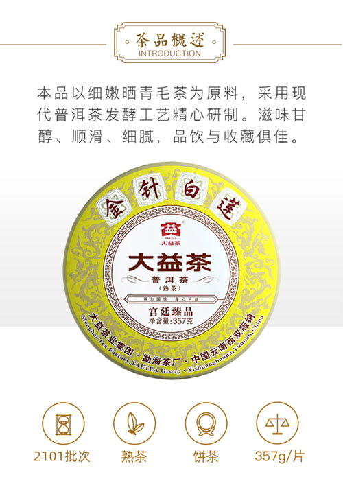 标的描述:云南普洱茶 大益2021年金针白莲熟茶