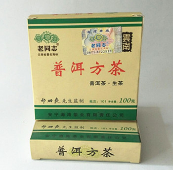 【简 介】老同志2010年101批100克普洱方茶小青砖,精选云南勐海县高海拔地区优质大叶种高山普洱茶为原料,精心配比后经高温蒸压而成,由普洱茶终身成就大师邹炳良先生监制。砖型工整大方,条索清晰,砖面油润光滑,芽叶肥壮,富有光泽,白毫显露,做工精细,茶汤金黄透亮,汤感细柔,湿润清甜,香气纯正,滋味鲜爽,回味持久,叶底滑润,质地柔软,活性强劲。具越陈越香特点。是纯天然原料与现代技术的完美结合的典范之作,为收藏、品饮、馈赠亲友之珍品。